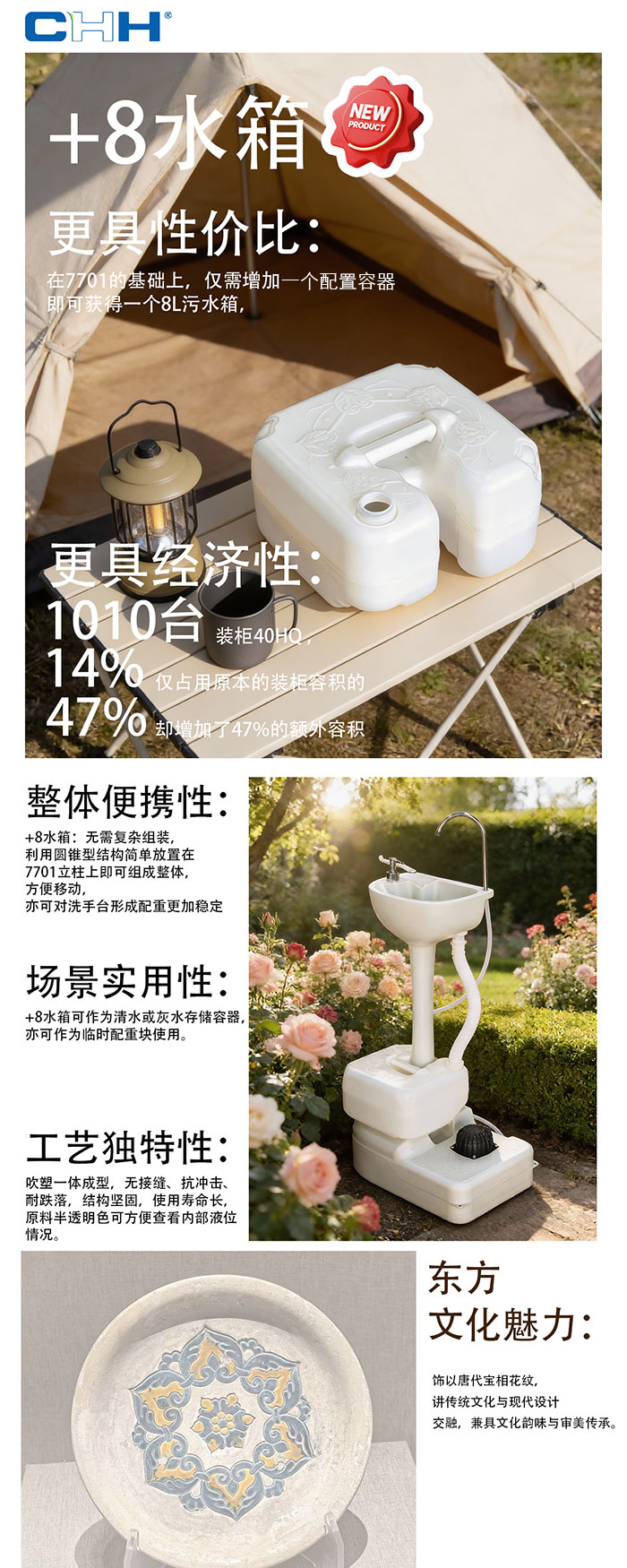 +8水箱,无需复杂组装,利用圆锥形结构可以简单卡在7701立柱上,与7701组成整体,方便移动。(此处配套一个+8水箱安装在7701上,然后整体利用7701小轮子移动的图片)+8水箱位于清洗台底座水箱上,也可对其形成配重,增加清洗台整体稳定性,且不增加清洗台的使用占地面积。(此处配一个俯视图说明+8水箱位于底座水箱上方且没有超过底座水箱外尺寸范围,同时配一个侧视图,说明+8水箱位于底座水箱上方对底座水箱形成配重)